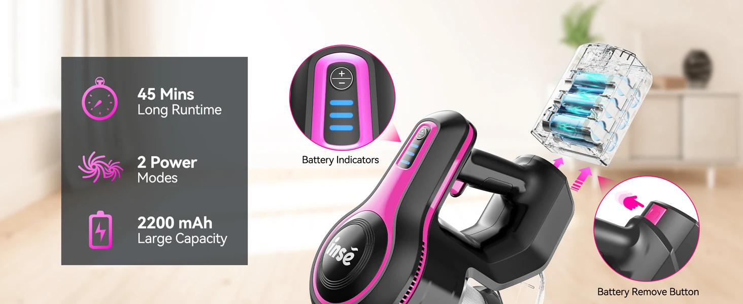 45min Long-Lasting Runtime -- The stick vacuum cleaner built in 6-cell 2200mAh large capacity Lithium-Ion battery, provides 30-45 mins running time on standard mode, 15-25 mins on max mode