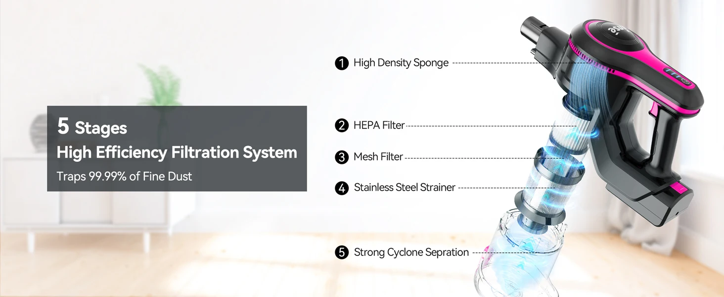 5 Stages High-efficiency Filtration -- The rechargeable vacuum cordless provides the ultimate purified air and an excellent cleaning experience for every user.