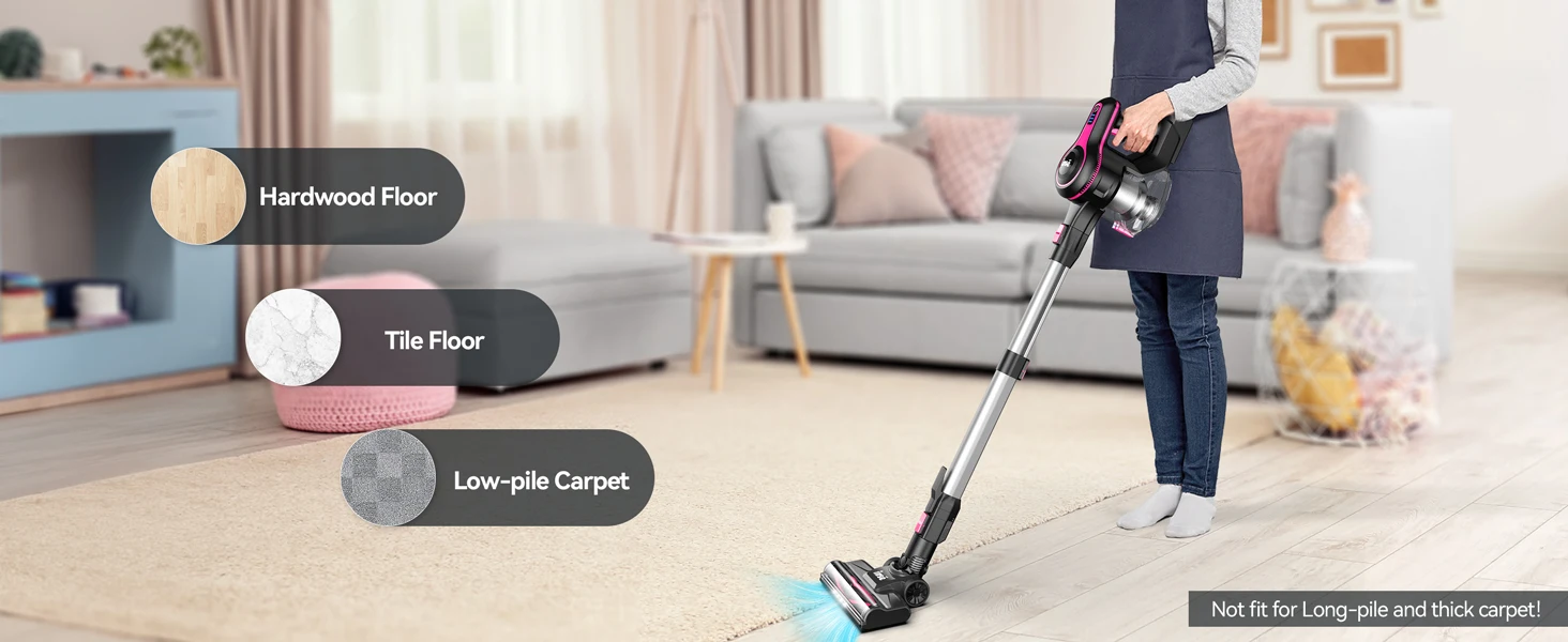 Hyper Powerful Suction -- The cordless vacuum cleaner provides up to 25Kpa strong suction in maximum mode and 12kPa powerful suction in standard mode to captures hair, cat litter, food, and other messes on the hardwood floors, low-pile carpet,stairs, bed, curtain, furniture, car, etc.This cordless vacuum generates less heat and less noise (60db) to offer a quiet working environment