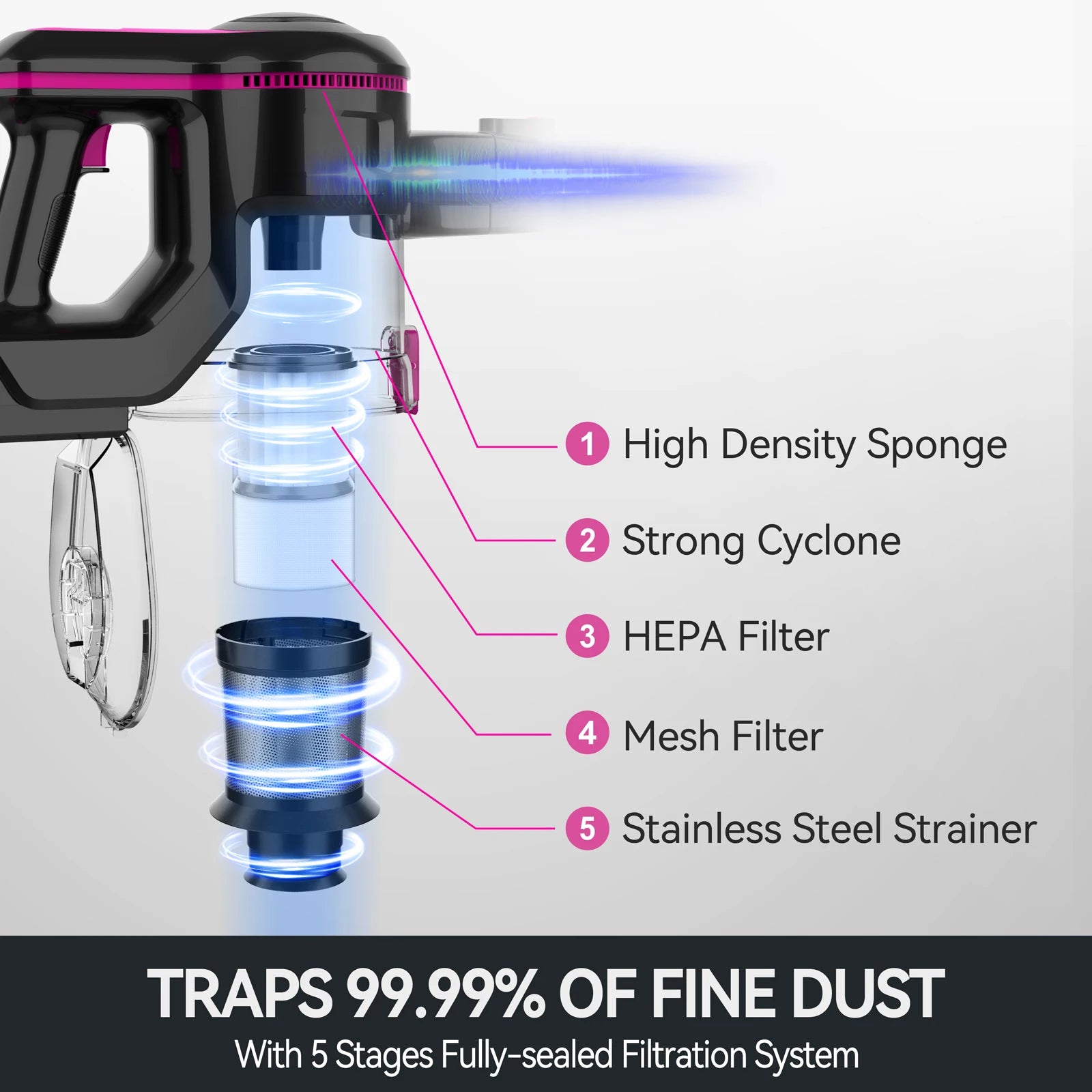 5 Stages Fully Sealed Cyclone Filtration System Captures 99.99% of Fine Particles as small as 0.1um